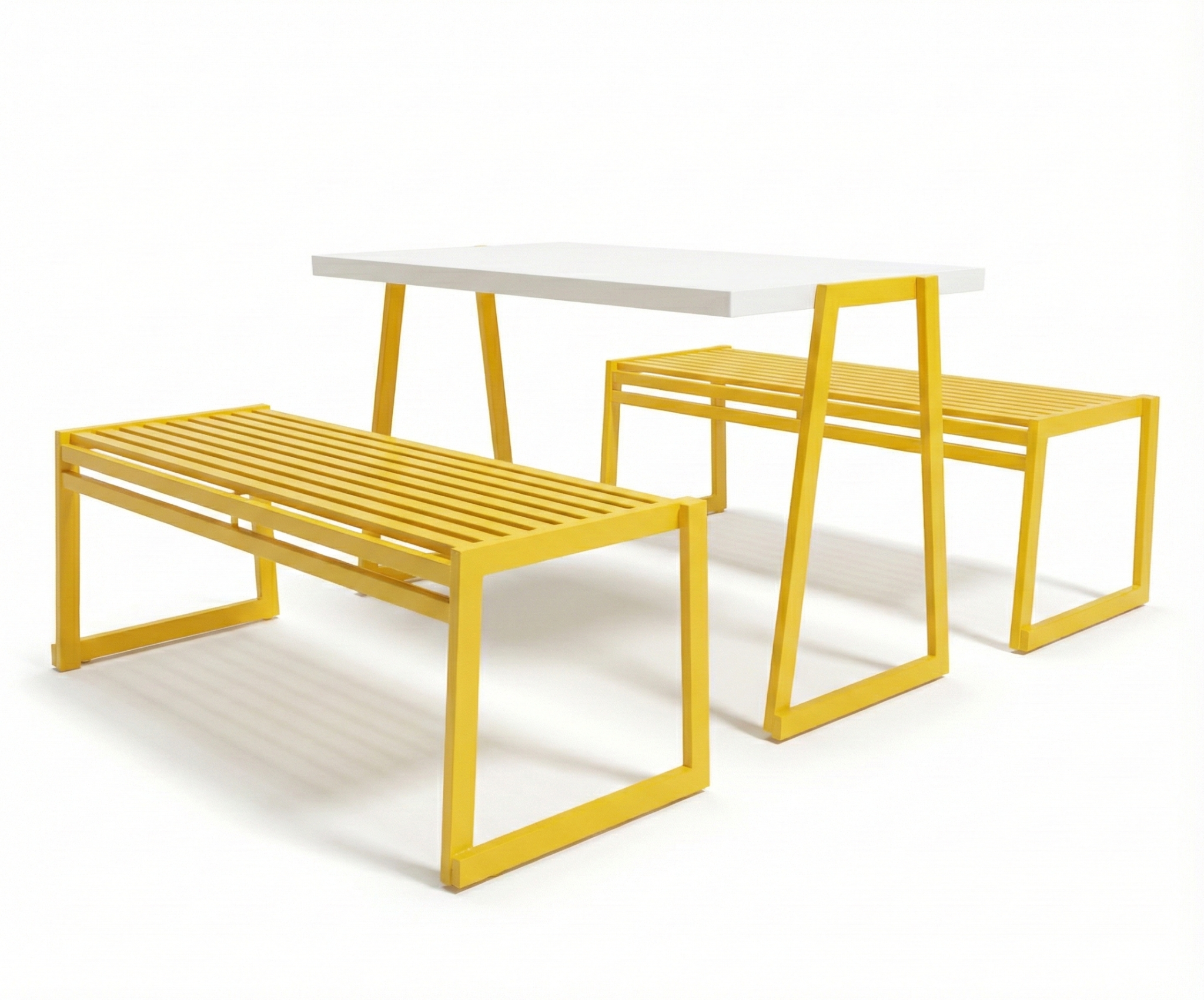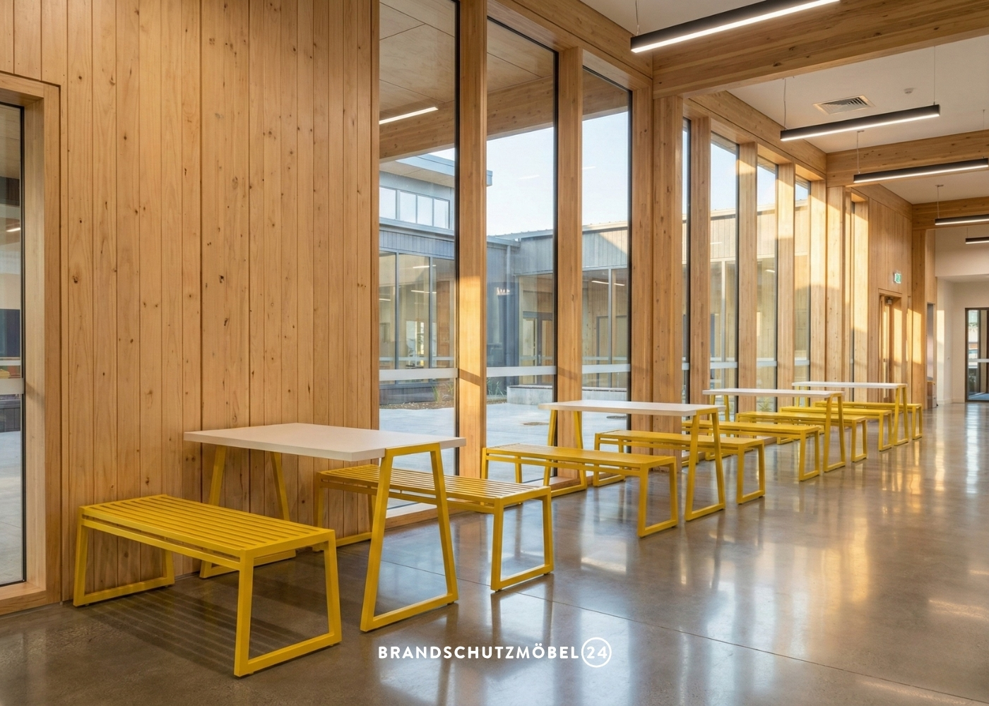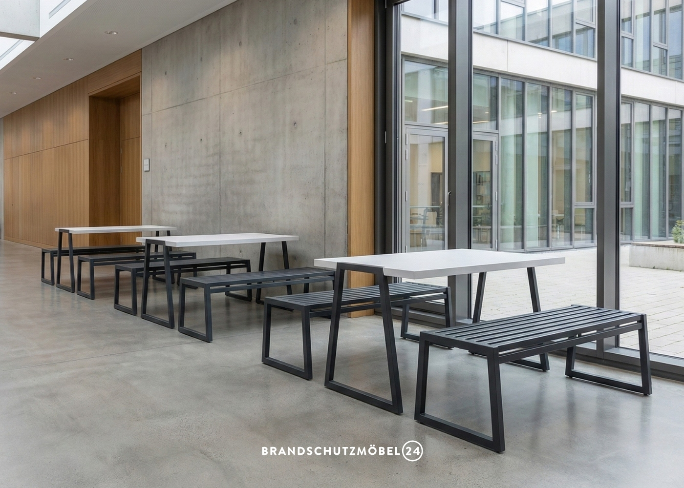 Die nicht brennbare Sitzgruppe beteht aus zwei Wangenbänken und einem Wangentisch ideal als Möbel für Fluchtwege für Flure, Foyers, Lernzonen und Wartebereiche, in denen Brandschutzauflagen besonders streng sind. Dank des nicht brennbaren Traggestells und der massiven Konstruktion ist Nemi nicht nur sicher, sondern auch dauerhaft stabil – selbst bei intensiver Nutzung im Schulalltag. Die Schul Sitzgruppe Nemi lässt sich bei Bedarf am Boden verankern (bei Notwendigkeit bitte mit Anfragen!)