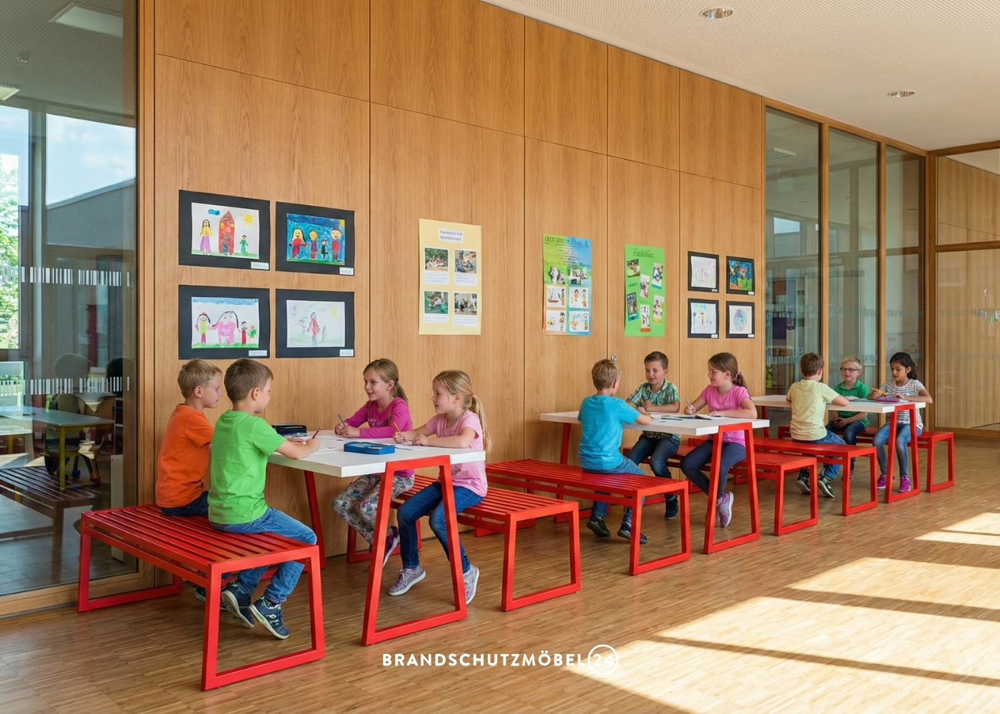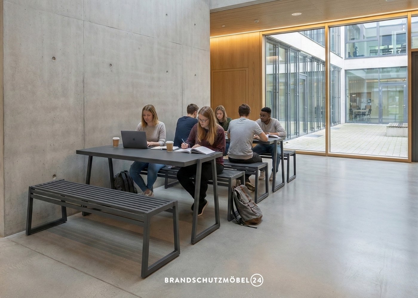 Die nicht brennbare Schulmöbel Sitzgruppe Nemi eignet sich ideal für Bereiche, in denen nicht brennbare Möbel nach DIN EN 13501-1 A1 / A2 gefordert sind. Ob Schule, Universität, Bibliothek oder öffentliches Gebäude: Nemi ist die robuste und einladende Sitzlösung für moderne Lern- und Aufenthaltsbereiche mit hohen Brandschutzanforderungen.